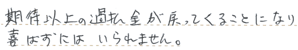 調査の結果、ほんのわずか数万円、残金より過払い金が上回ったため、請求に踏み切りました。裁判対応を選び、調査報告書どおりの金額が返金される予定です。