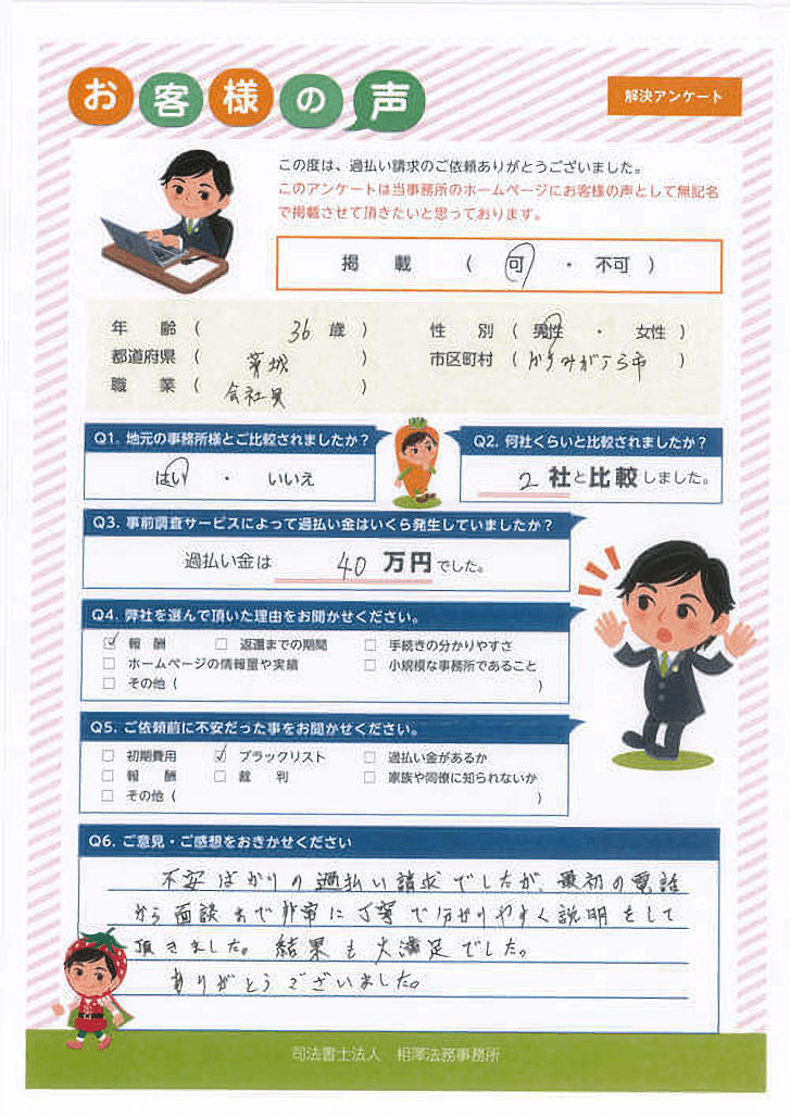 相澤法務は、他社と比べて、自分にとってメリットが多く感じられました。他社との比較で、戻る額が多いかもと期待が持てました。(略)また、手数料も分かりやすく案内されていました。