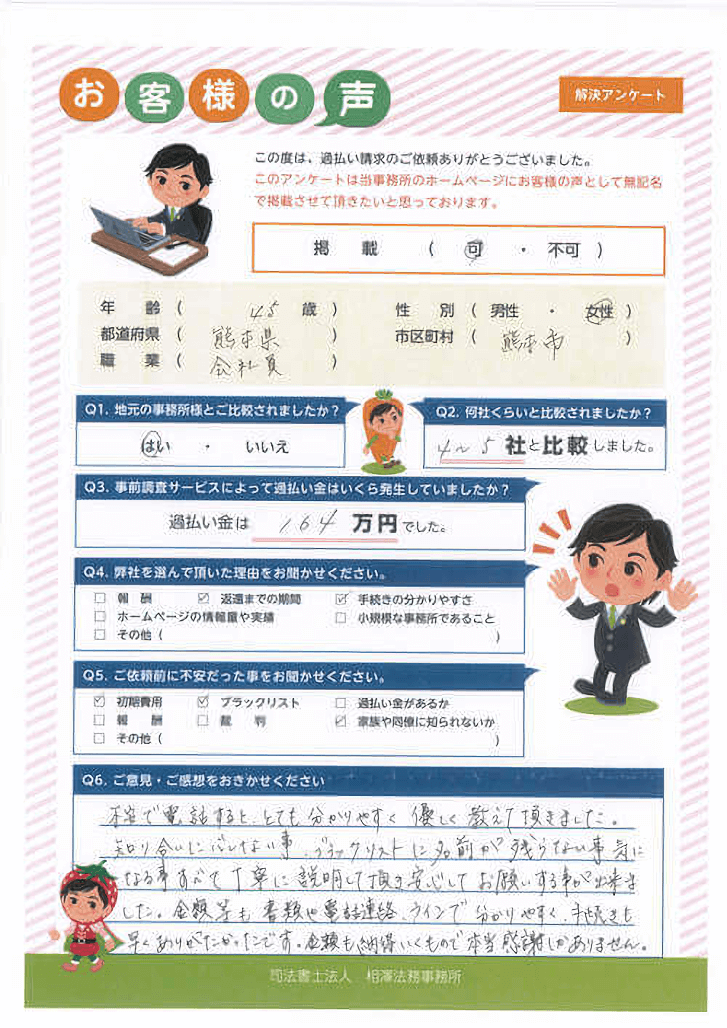 2025年12月現在での熊本県での過払い金請求相談実績(ご依頼を頂き、実際に過払い金が返金され解決した方の合計)になります。 熊本県には多くの弁護士(法律事務所)・司法書士事務所が存在します。 以下相澤法務事務所での相談実績(口コミ・評判)を紹介しますので、ご依頼の際の参考にしてください。