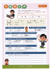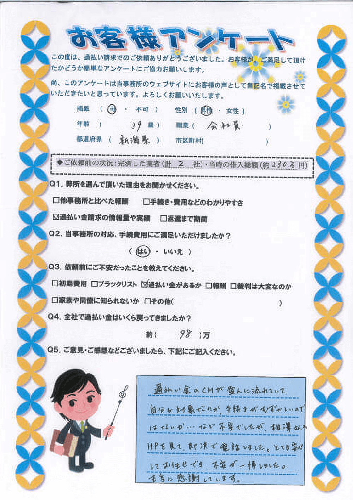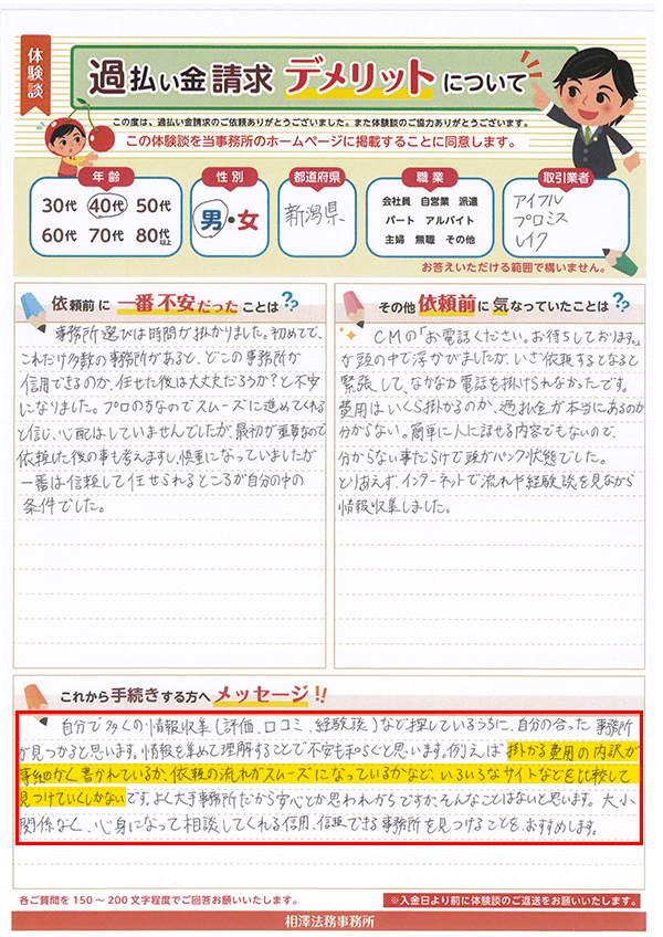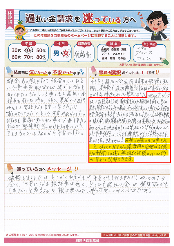 相澤法務にした決め手は、過払い金請求の費用がわかりやすく表示 されている事と、こちらの不安に対する答えがすべて書いてあり、お願いしてみようと思わせてくれるものがあった ので決めました。そして、面談は一度だけで、後のやりとりがTEL or LINEだったのも助かりました。とくにLINEは記録に残るので、忘れる事もなく良かったです。