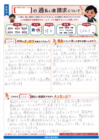 最初のお電話のときに、「郵便でのやりとりがメインで、訪問は一回だけ」だとうかがいました。手数料や期間、裁判についても、見積り後に裁判するパターン・しないパターン、その際の期間なども具体的に説明いただき、安心して申し込めました。多く払い過ぎているものが返るだけ、生活にも影響なし。やらないのはもったいないです。該当する方はぜひやってほしいと思います。