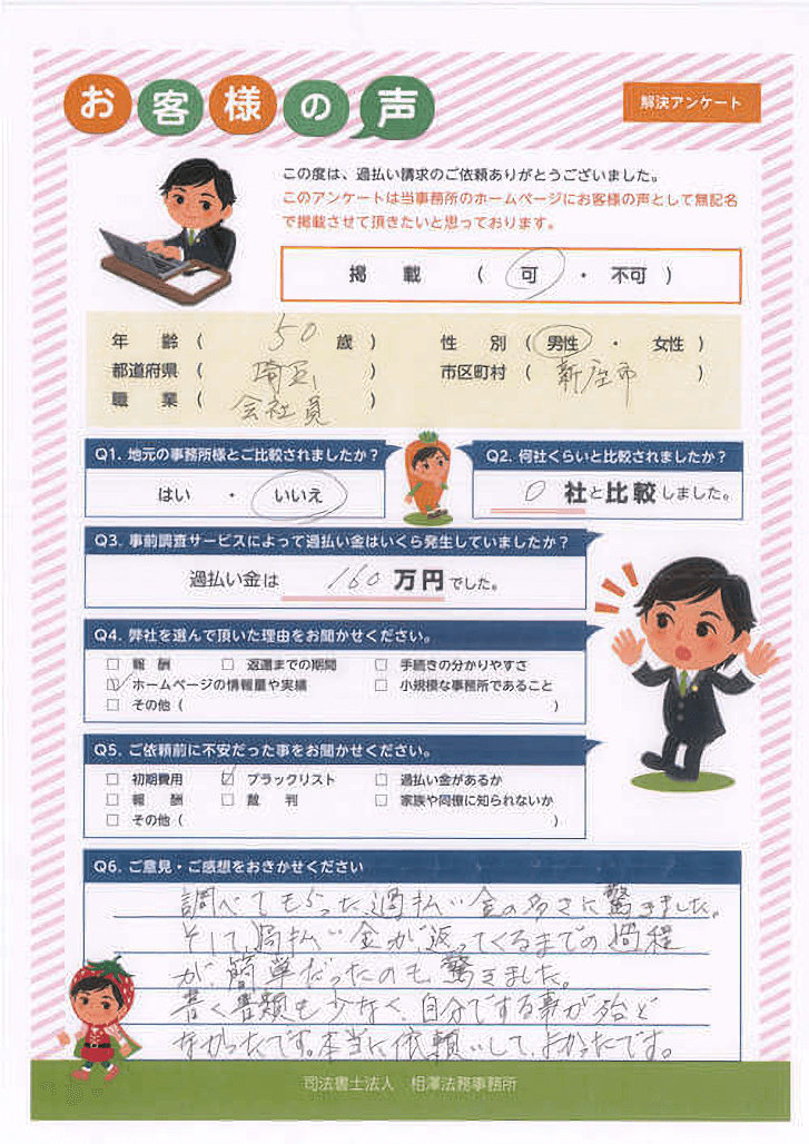 インターネットで過払い金の口コミ等を検索していたところ、見つけたのが相澤法務のホームページ。不安だった部分や不明点などがわかりやすく細かく記載してありました。過払い金診断は無料だったので、とりあえずLINEを送ったところ、すぐに返信が来て、対応も良かったのでお願いしました。